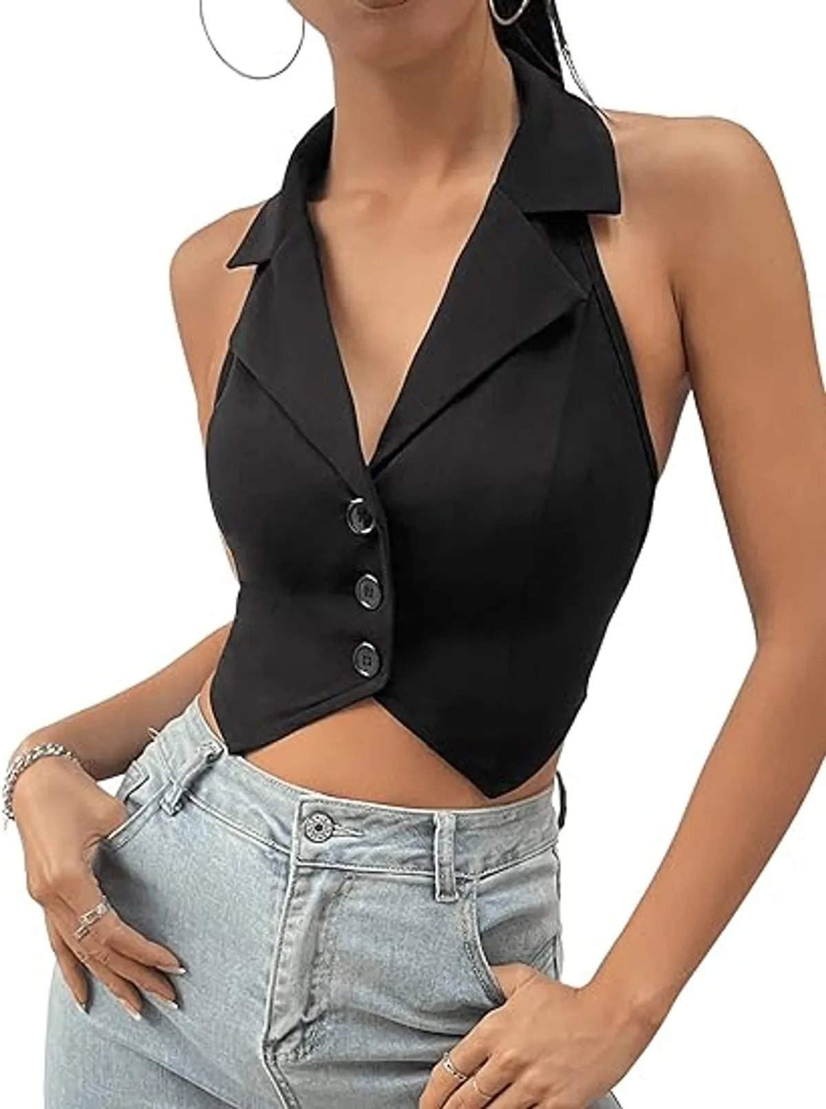 Soft fabric has some stretch Feature: Lapel Neck, Sleeveless, Backless, Cropped Length, Single Breasted Blazer Vest Occasion: Perfect for street, hanging out, work out, shopping, office and daily wear
