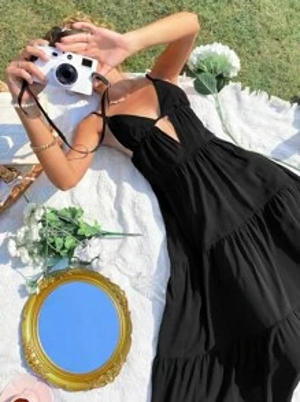 Black Color Cut Out Front Ruffle Hem Cami Dress